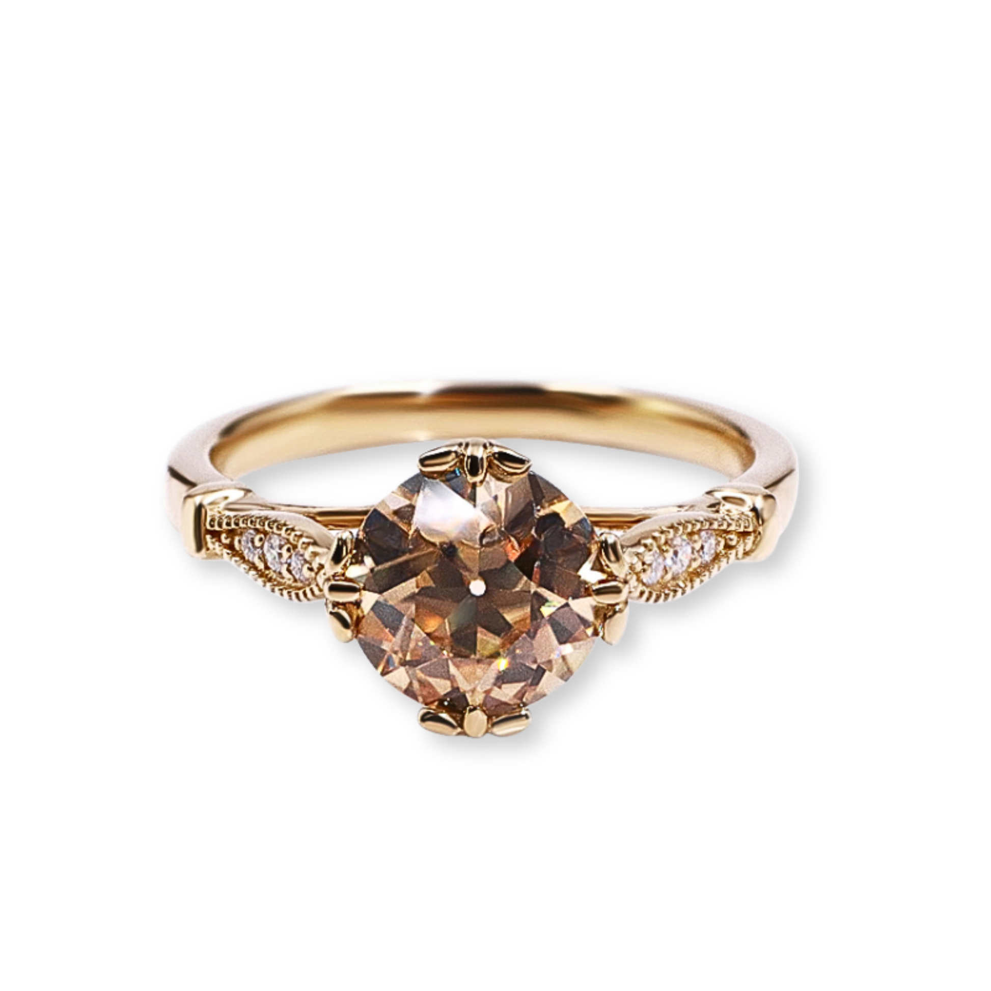 Amarante is cast in solid eighteen-carat gold and finished by hand to a high polish. The centre stone is a champagne moissanite in the Old European Cut, prized for its vintage brilliance and warm tone. Pavé accent stones are hand-set into each shoulder, framed with delicate milgrain work that reflects the care and precision of our atelier. The structure is thoughtfully engineered to allow light to travel through every facet, giving the ring its soft and lasting radiance. All stones are ethically sourced and crafted using certified materials that meet Cascadia’s standard of purity, integrity and timeless design.