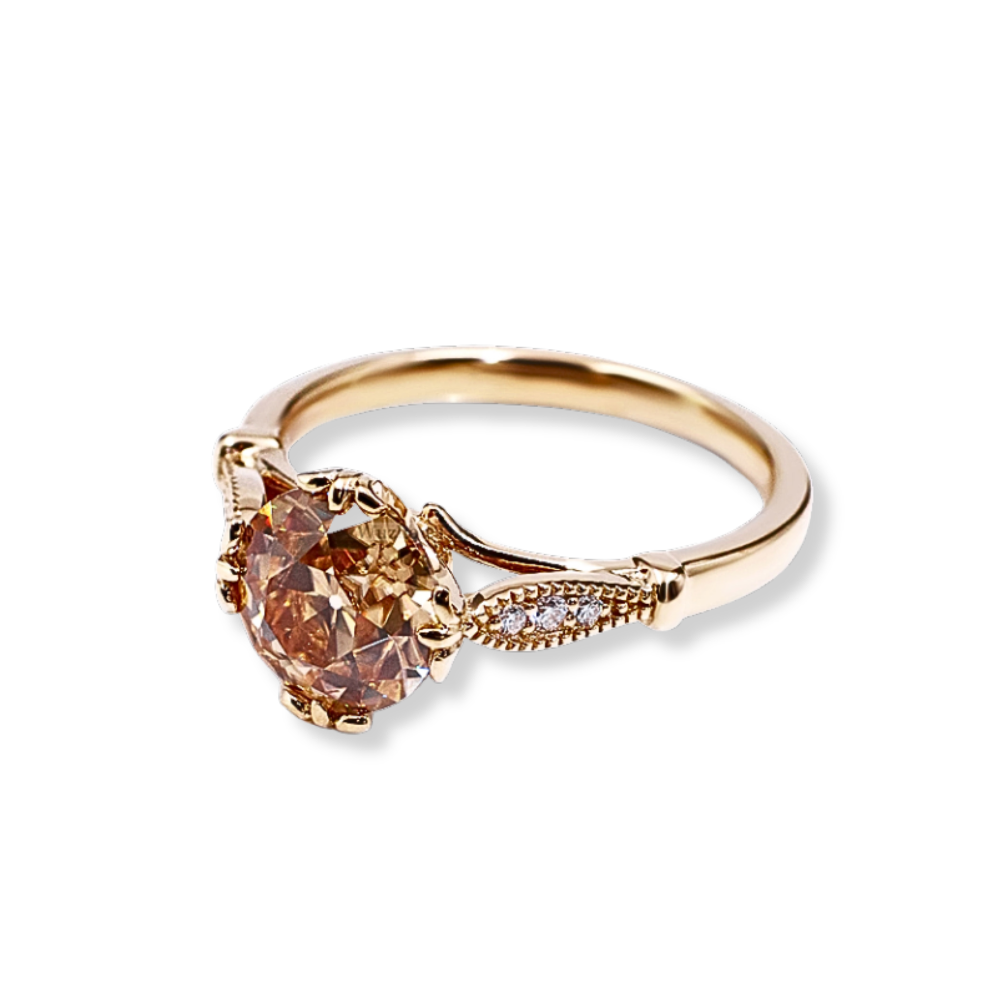 Named after the amaranth flower, known for its enduring bloom, Amarante is a quiet statement of everlasting affection. A champagne-toned moissanite sits at its centre, cut in the vintage OEC style to evoke softness, depth and fire. The stone is set in a delicate claw mount, flanked by two marquise-inspired shoulders with fine pavé stones. A whisper of milgrain detailing adds an antique softness, while the silhouette remains modern and refined. Romantic without excess, Amarante is a ring for those who love with intention.