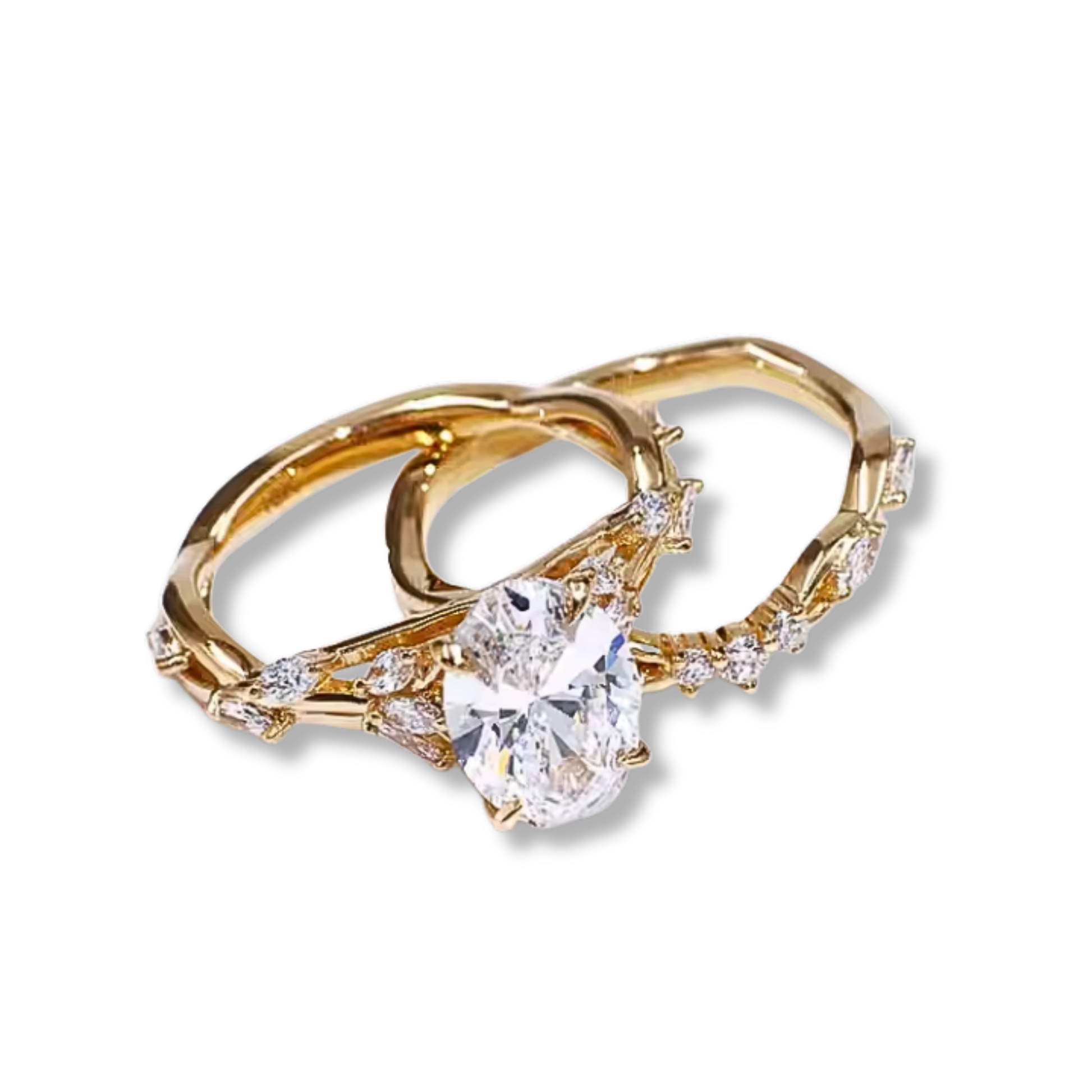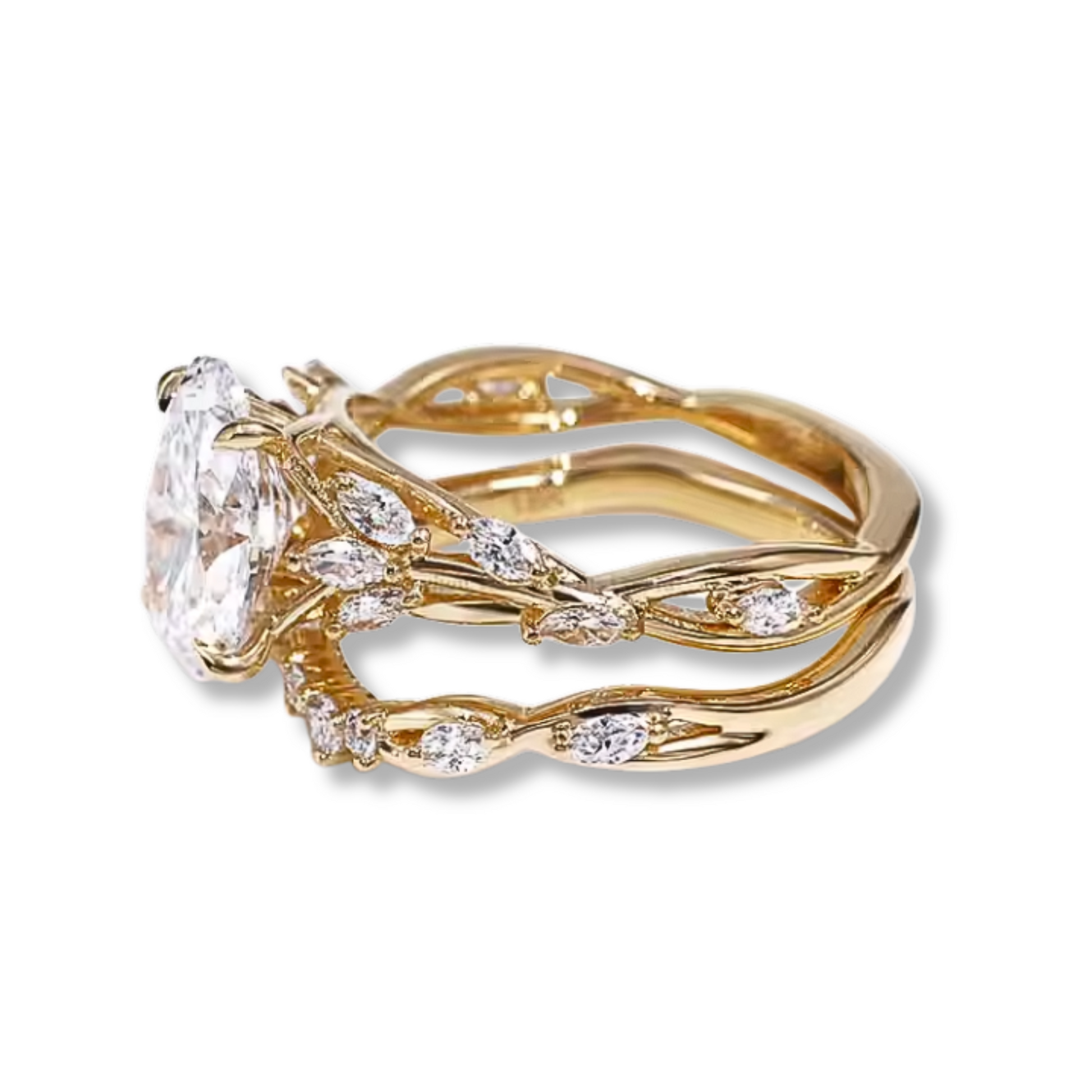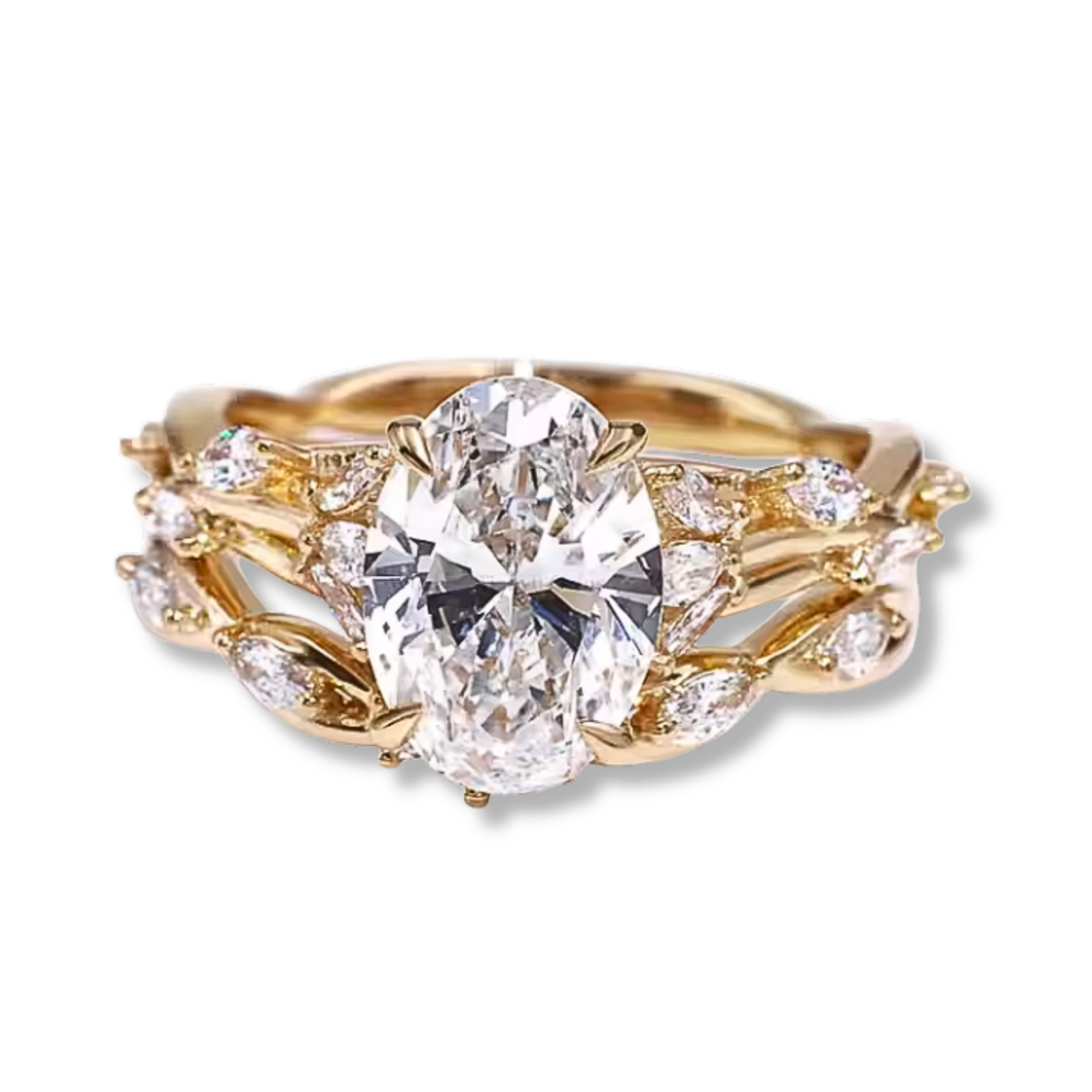 A celebration of everlasting union, Liora is a duet of golden harmony, crafted in pure eighteen-carat yellow gold and crowned with an oval cut moissanite of exceptional brilliance. Fine marquise and round stones trace the band like glints of starlight along a quiet forest path. Designed as a timeless pairing, each ring echoes the other with subtle symmetry, making Liora the embodiment of devotion in its most graceful form.