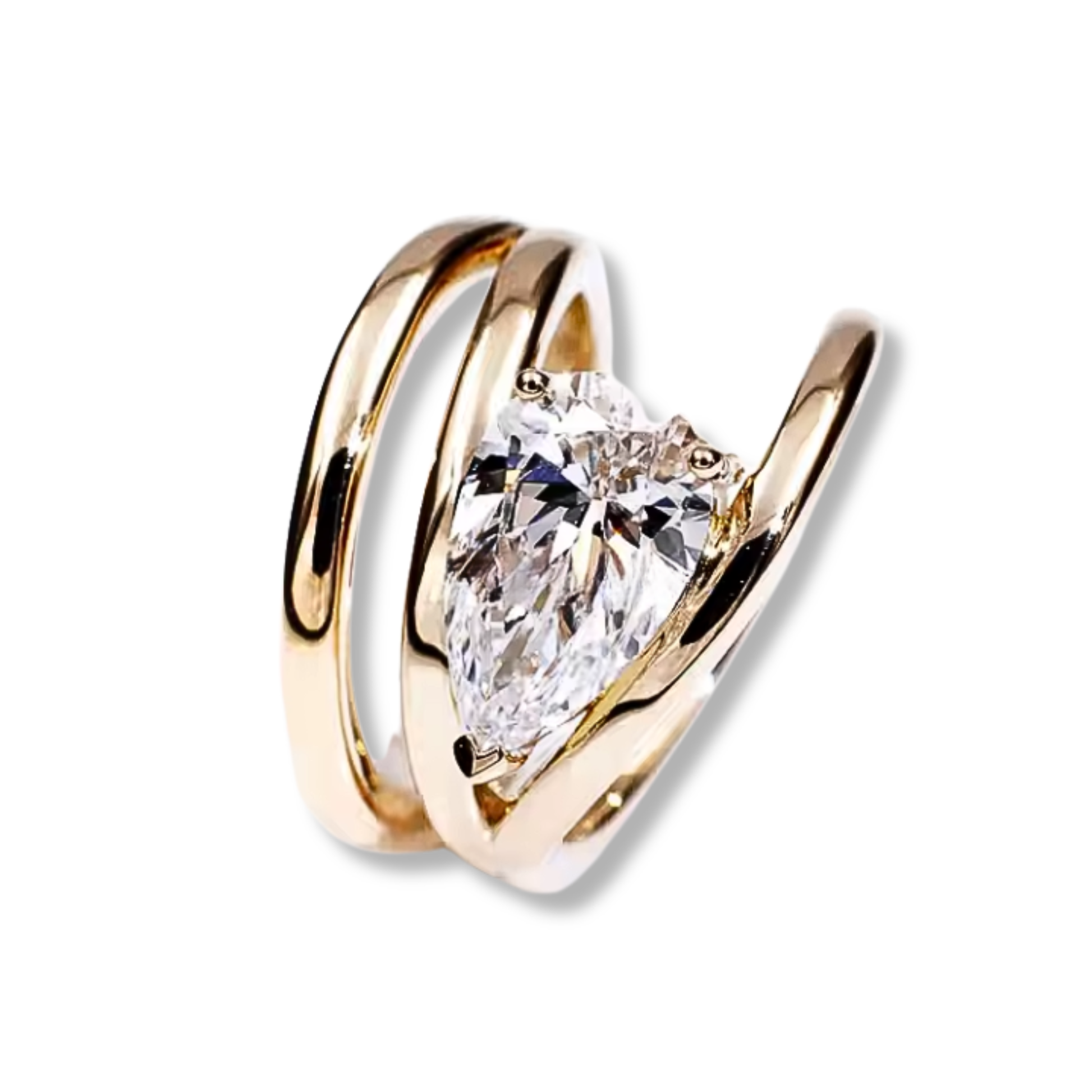 A study in modern restraint, Véline is sculpted in polished 18 carat yellow gold and crowned with a 2.52 carat pear cut lab grown diamond of exceptional brilliance. The open band silhouette enhances its sculptural asymmetry, allowing light to dance freely through each facet of the stone. With clean lines and quiet confidence, this ring speaks to the modern romantic — bold in elegance, subtle in expression.